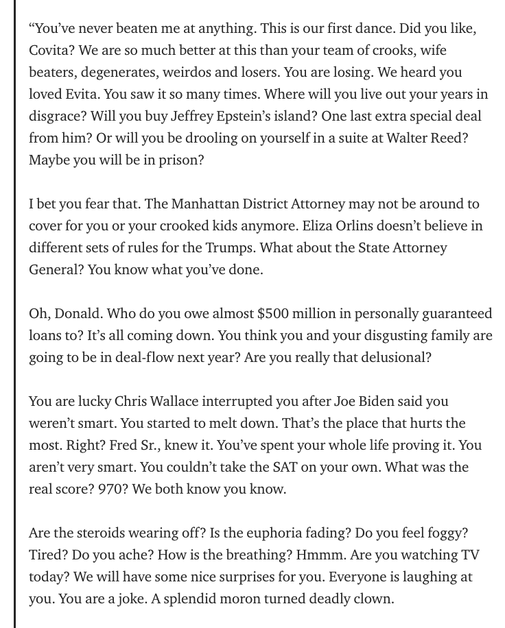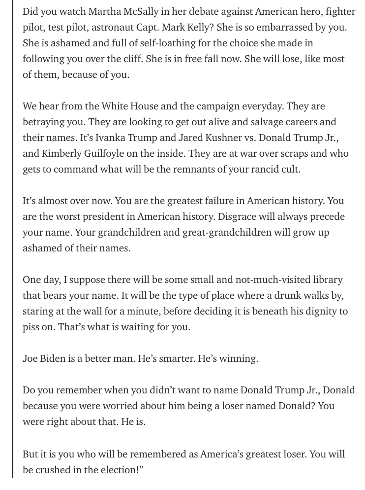 More Republicans are speaking out about Trump and politics. There are an unprecedented number of Republicans speaking out in advance of the election this year. This guy, Steve Schmidt, who has worked to help elect his party members for many years, recently acknowledged that his career as a Republican campaign organizer is likely over. He may be wrong though because future politicians who observe his powerful work may still want him. He works with the Lincoln Project and if you haven’t seen their ads, you haven’t been paying attention. Trump recently took after him in his typical fashion and this was Schmidt's scathing response.